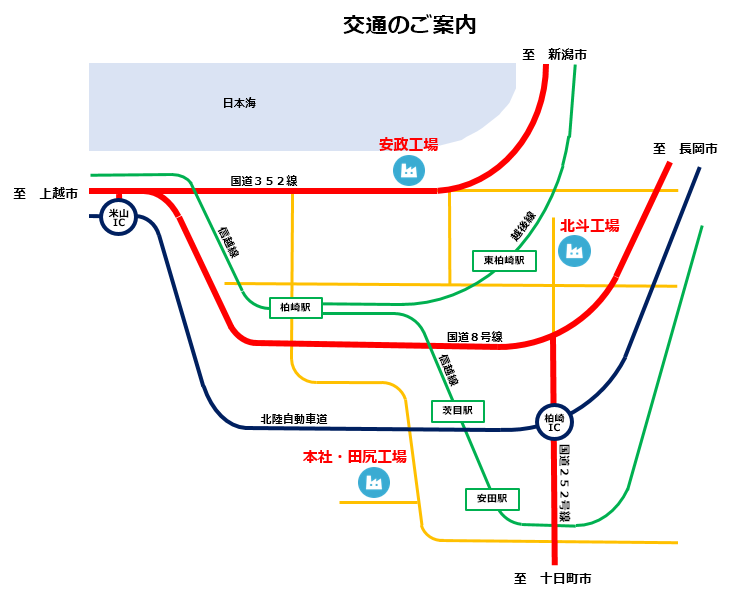 ●安政工場 〒945-0071 新潟県柏崎市安政町2番50号 TEL (0257) 23-2541(代) 電車の場合 ・長岡駅(信越本線)→柏崎駅からタクシーで約11分 ・長岡駅(信越本線)→柏崎駅(越後線)→東柏崎駅から徒歩で約23分(タクシーで約5分)